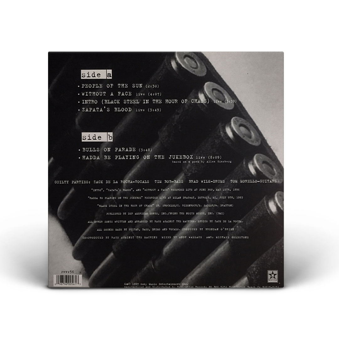 Rage Against The Machine needs no introduction. If you're wondering how we got to release a record by a band this big, you must not know that their vocalist, Zack De La Rocha, sang for Revelation Records' alumni Inside Out before he started Rage Against The Machine. This is a Revelation, exclusive, 10" vinyl record featuring "People Of The Sun" and "Bulls On Parade" along with some unreleased tracks, including a live version of Public Enemy's "Black Steel In The Hour Of Chaos" with Chuck D helping out on vocals. New pressing now available on opaque grey vinyl.